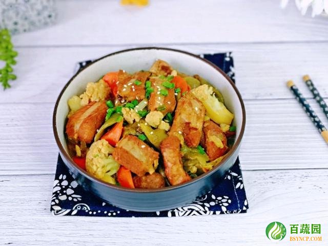 13、炒匀之后加入焯水后的花菜和胡萝卜,一起炖烂,等到菜都炖熟之后大火收汁,然后关火装盘就行了。